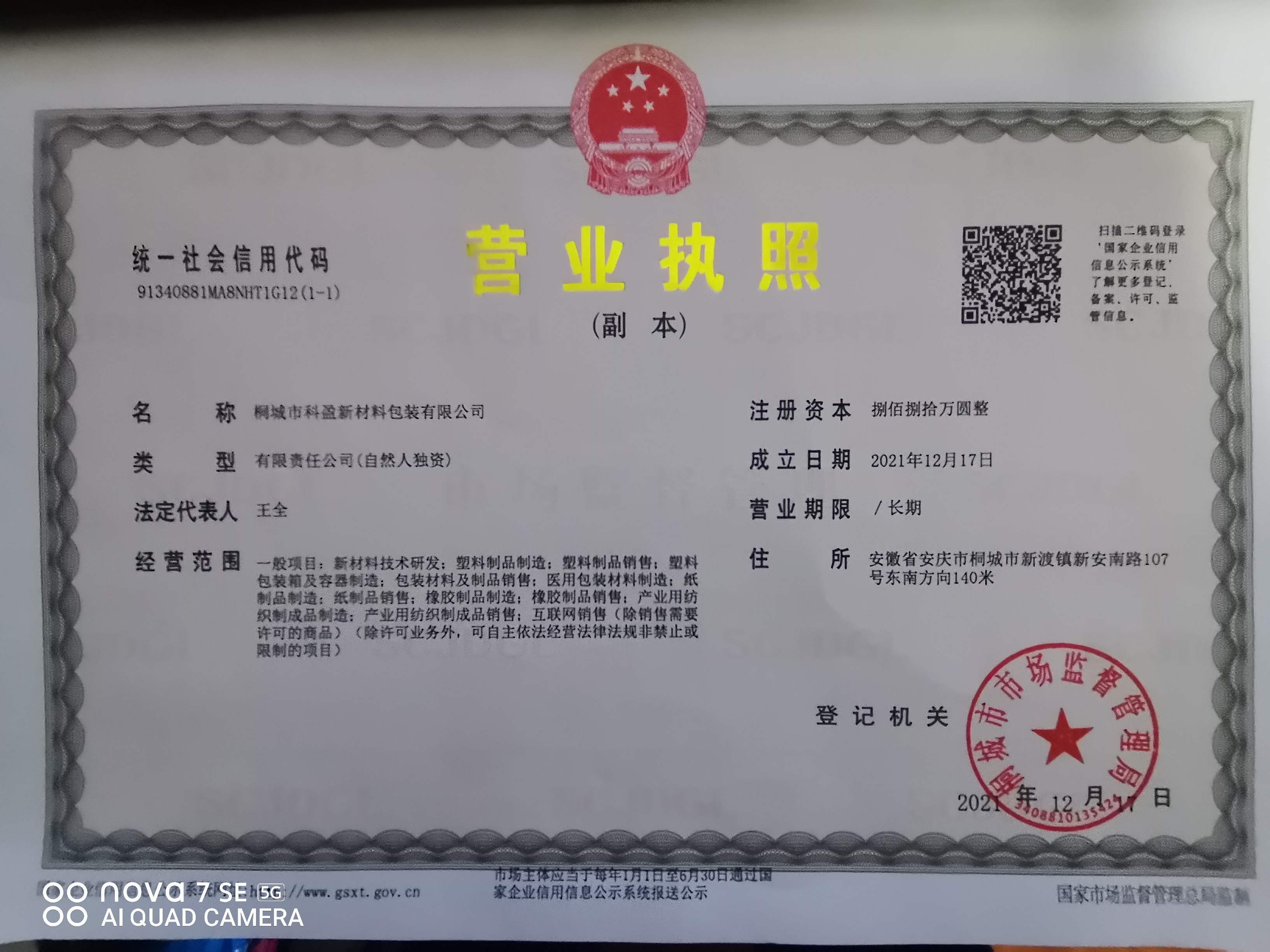 桐城市科盈新材料包裝有限公司 版權(quán)所有 皖I(lǐng)CP備2022012869號(hào) 營(yíng)業(yè)執(zhí)照